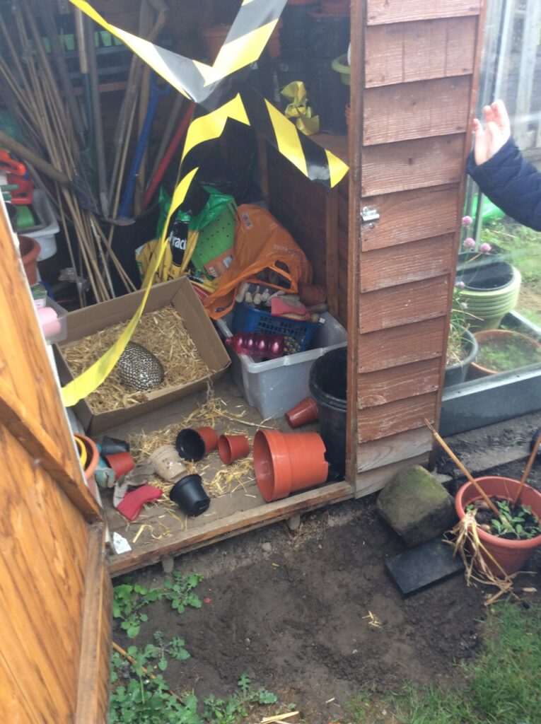 On arriving at school Monday morning, Year 3 children discovered that we had had an uninvited visitor over the holidays. It seems a mysterious, mythical creature had decided to make its nest in our school garden. Plant pots were overturned, the shed door was broken and their were even strange, foot-print like markings on the floor. Using our inference skills, we deduced that the gigantic, golden egg might belong to a dragon. Year 3 have been enjoying reading “The boy who grew dragons” this term so we know that some dragon’s like to eat vegetables so perhaps the mother was after what we have planted in the garden!