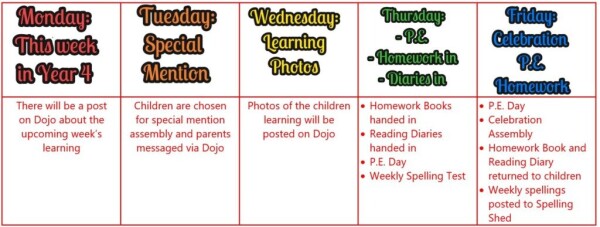 • Homework books and reading diaries are collected in on a Thursday and handed out on a Friday.