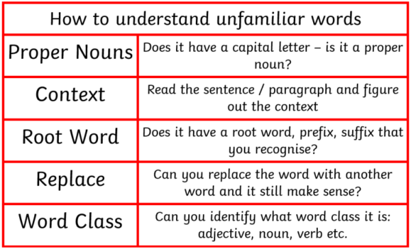 Pathways uses glossaries, dictionaries, images and various other support strategies to help children understand an unknown word. Running alongside this, children at St. Alban’s are taught the following five strategies to understand a word when they don’t have access to any support: